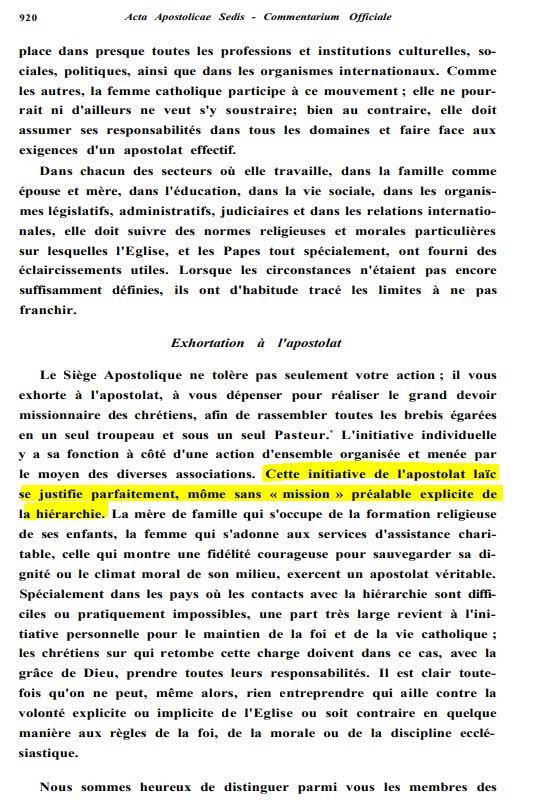 “Cristo, antes de ascender al cielo, confió a sus apóstoles y por ellos a toda su Iglesia, la tarea de predicar el Evangelio al mundo en su nombre . Por tanto, todo cristiano debe darse cuenta de que parte de esta responsabilidad recae sobre sus hombros ... LA INICIATIVA DEL APOSTOLADO LAICAL ESTÁ PERFECTAMENTE JUSTIFICADA INCLUSO SIN UNA PREVIA 'MISIÓN' EXPLÍCITA DE LA JERARQUÍA ... La iniciativa personal juega un gran papel en la protección de la fe y la vida católica, especialmente en países DONDE LOS CONTACTOS CON LA JERARQUÍA SON DIFÍCILES O PRÁCTICAMENTE IMPOSIBLES. En tales circunstancias, los cristianos sobre quienes recae esta tarea deben, con la gracia de Dios, asumir todas sus responsabilidades... Aun así, no se puede emprender nada contra la voluntad explícita o implícita de la Iglesia, o contrario de alguna manera a las reglas de la FE O MORAL, O LA DISCIPLINA ECLESIÁSTICA.”